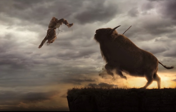 그리고 첫 장면에 나왔던 버팔로 사냥터가 나옵니다. 버팔로 무리를 절벽으로 몰아 떨어뜨리는 방식으로 사냥을 하지만 한 마리 버팔로가 나약한 케다를 공격해 절벽으로 떨어뜨립니다. 절벽 중간에 떨어져 의식을 잃은 케다를 목놓아 불러보지만 하루가 지나도 깨어나지 않아 부족들은 죽었다고 생각합니다. 아버지는 슬픔을 안고 부족장으로써 부족원을 이끌고 집으로 돌아갑니다.