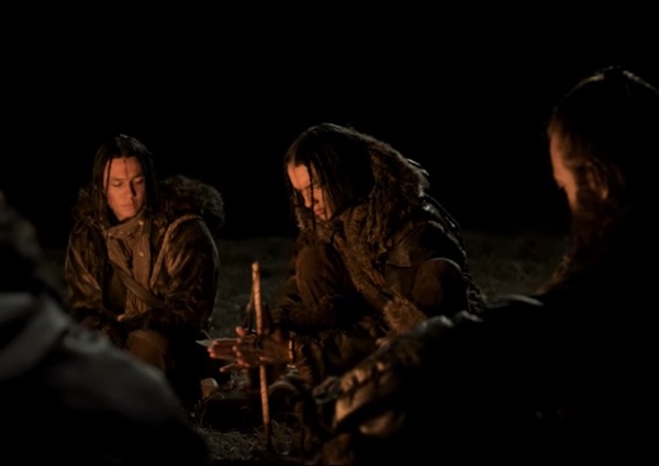 이 사건이 일어난 일주일 전으로 돌아가 해가 넘어가고 어스름해지기 전 부족들이 둘러앉아 사냥을 준비하는 장면으로 넘어갑니다. 사냥에 데리고 갈 신입을 뽑는데 그 기준은 자신의 무기가 될 씀베찌르개를 얼마나 날카롭고 정교하게 다듬었느냐입니다. 부족장이 한 명씩 테스트하는데 단 두명만이 합격을 하게 되죠. 그리고 "우리의 여정에 고통이 함께 할 것이다." 라며 통과의뢰를 치르게 되는데 건장한 사내들이 신입들을 구타합니다. 정신교육 중의 하나죠.