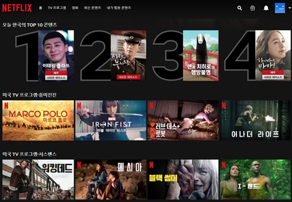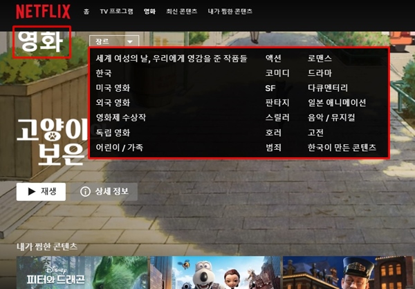 넷플릭스는 TV 프로그램, 영화, 최신 콘텐츠, 내가 찜한 콘텐츠로 되어 있습니다. TV 프로그램에는 한국 드라마, 미국 드라마, 영국 드라마, 버라이어티, 로맨스, 코미디 등으로 분류되어있고, 영화에는 여성이 본다, 한국영화, 미국 영화, 영화제 수상작, 독립영화, 어린이/가족 등으로 소분류됩니다.