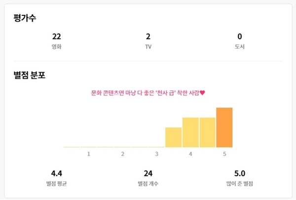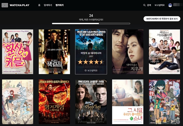 왓챠플레이의 강점은 '평가하기' 기능이 있습니다. 여러 콘텐츠 목록 중 자신이 좋아하는 콘텐츠에 별점 5점까지 줄 수 있고, '보고 싶어요'라고 선택을 하면 '보고 싶어요' 란 메뉴에서 다시 볼 수 있습니다.