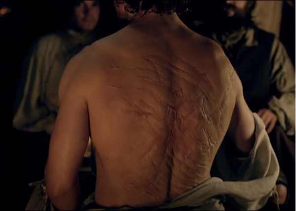 제이미를 치료하던 중 그의 등이 채찍질의 흉터로 난도질이 되어 있는 것을 보고 놀라워합니다. 그의 등을 갈기 찢어지도록 채찍질한 사람이 바로 블랙 잭 랜들 대위입니다. 클레어를 잡으려고 했던 프랭크의 조상 그 랜들 대위입니다. 랜들 대위는 제이미에게 여러 가지 혐의를 입혀 그를 잡으려고 합니다. 꿍꿍이가 있습니다.