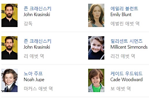 출연 : 존 크래신스키 (리 애벗 아빠 역), 에밀리 블런트, 밀리센트 시먼즈, 노아 주프,케이드 우드워드