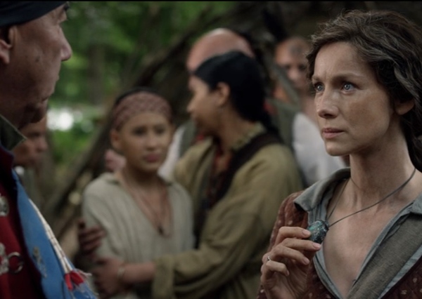 이 사실을 알게 된 브리애나는 제이미에게 분노하며 야만인이라 합니다. 제이미는 로저를 찾을 때까지 돌아오지 않겠다고 약속을 하고 클레어와 이안이 함께 떠납니다. 머타가 대신 브리애나를 조캐스타이모님댁으로 보내 편안히 지내게 하겠다고 하죠. 두달만에 모호크족 마을에 도착한 제이미와 클레어, 그리고 이안은 족장을 만나 로저와 거래하자고 제안합니다. 족장은 흔쾌히 그렇게 하기로 하는데 클레어 목에 걸린 원석의 목걸이를 보자 그들은 거래를 취소하고 그들을 보내버립니다.