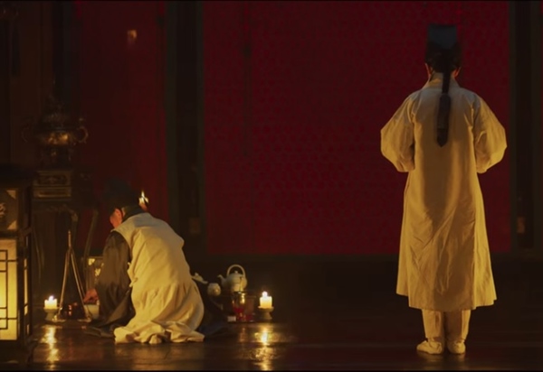 통명전 앞 무릎을 꿇으며 강녕전에 있는 아바마마를 뵙게 해달라고 중전에게 청했으나 중전은 두말없이 거절합니다. 나이가 어리나 세자의 어미인지라 어미의 명령을 거절할 수는 없었지요. 궁궐의 모든 궁인들이 해원 조씨 앞에 무릎을 꿇으니 세자는 좌익위 무영을 부릅니다. 세자는 그에게 약방일기를 가져오라고 하죠. 그리고 그날 밤 몰래 강녕전으로 침입합니다.