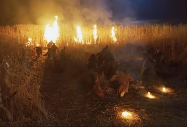 당도한 곳은 갈대숲이었고 화전민들은 세자일행을 살려두면 마을 사람들을 모조리 죽일 것을 염려하여 세자일행을 공격하려 합니다. 그때 해가 저물면서 좀비들이 깨어나고 살기위해 좀비들을 베고 또 베어냅니다. 갑자기 하늘에서 불꽃이 떨어지더니 그들 주변으로 불이 타오르고 알 수 없는 무리들이 와 좀비들을 처단합니다. 세자일행을 도와준 이 무리들은 바로 안현대감과 가노들이었습니다.
