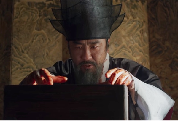 강녕전에 들어갈 수 있는 사람은 조학주대감과 중전뿐이었습니다. 그런 조학주대감이 대제학을 비롯해 신하들이 임금을 뵙겠다고 하자 조학주대감도 함께 임금에게 가자고 합니다. 임금의 침전 앞에 앉은 신하들은 해가 저물자 괴물로 변한 임금을 보고 기겁하게 되죠. 조학주는 임금이 아직도 살아있는데 역모를 꾸민 대제학과 유생들을 의금부로 끌고 가라고 합니다. 그리고 중전에게 들린 조학주대감은 아들의 목을 중전에게 보여주죠.