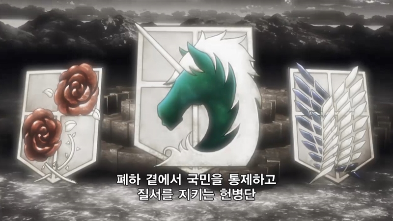 거인으로부터 인류를 지키는 세 개의 병단이 있습니다. 벽을 강화하고 도시를 지키는 주둔병단, 희생을 각오하고 벽 밖의 거인영역에 도전하는 조사병단, 왕의 곁에서 국민을 통제하고 질서를 지키는 헌병단입니다.