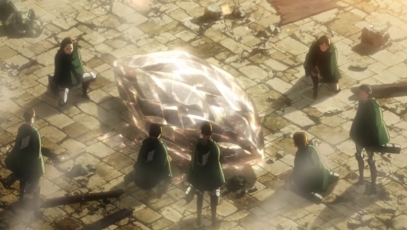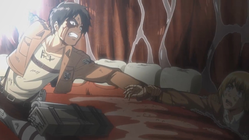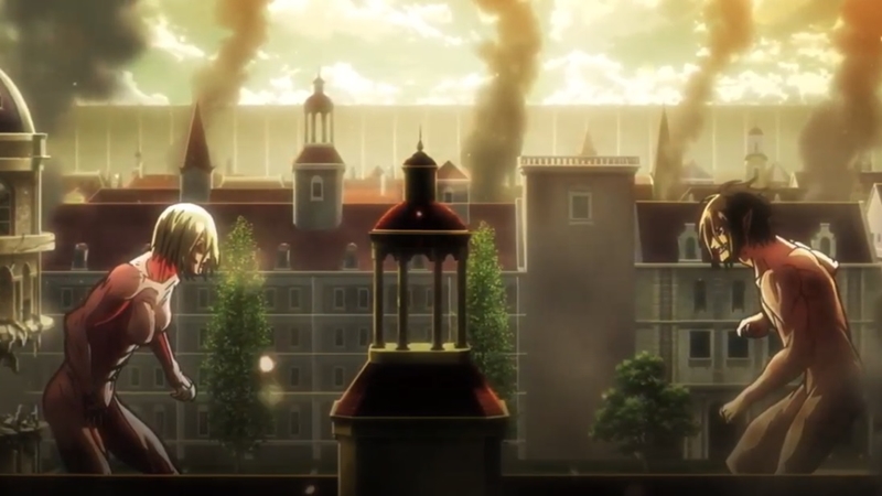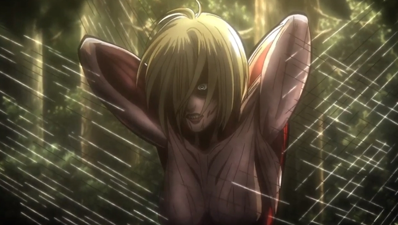 정신을 잃고 미쳐 날뛰는 엘렌 거인은 애니의 목덜미를 물어뜯으려고 합니다. 애니의 거인이 엘렌의 거인과 융합하려 하자 리바이 병사장이 엘렌을 구해냅니다. 엘렌의 거인과 융합하던 애니는 자신의 몸을 경화하여 잠들어버립니다.