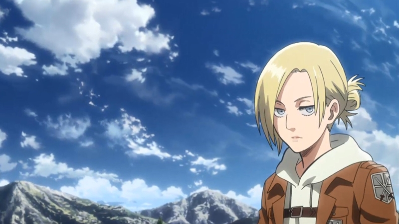 월 시나의 스토헤스 구에서 빠져나가기로 작전을 펼치는데 아르민과 미카사, 엘렌 그리고 애니는 지하 입구로 들어섭니다. 하지만 애니는 지하로 들어가기를 거부합니다. 아르민과 엘렌은 애니에게 들어와서 증명하라고 하죠. 애내가 거인화하려고 하자 아르민은 연막탄을 쏘아 알립니다. 애니는 손가락에 낀 반지에 침으로 자신의 손가락을 찌른 후 거인화하죠.