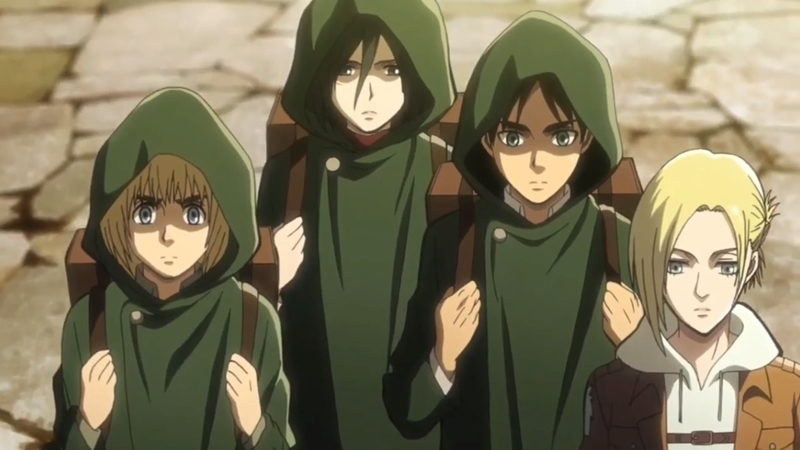 주인공 세명 엘렌, 미카사, 아르민은 조사병단으로 들어가기 위해 훈련병단에 먼저 입소하고 그곳에서 동료들을 만나게 됩니다. 장, 애니, 라이너, 베르톨트, 크리스타, 사샤, 유미르 등의 여러 동료와 함께 훈련을 받고 3년 뒤 졸업을 합니다. 그리고 훈련병단 상위 10명에게만 주어지는 헌병단 입단 권한을 마다하고 조사병단 입단을 결심합니다. 그리고 미카사, 아르민도 조사병단을 지원하죠.