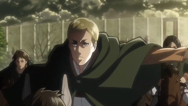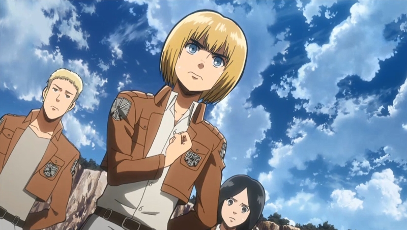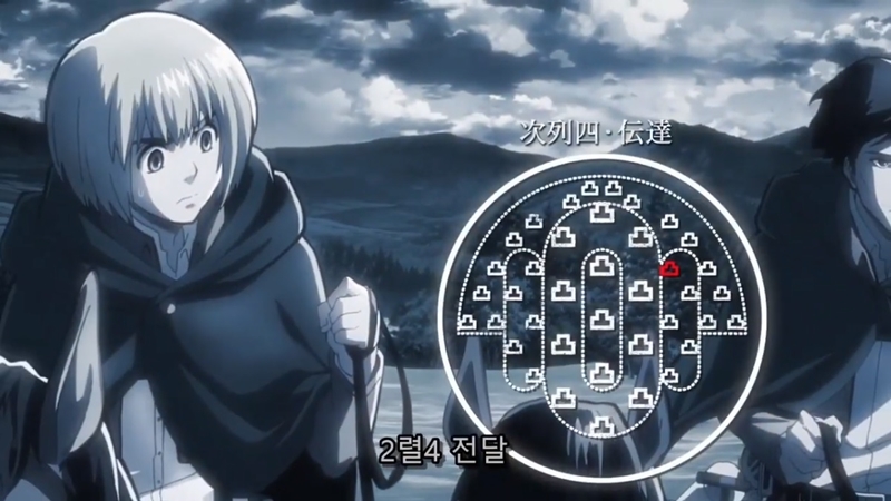 벽 밖 조사작전을 수행할 때 장거리 탐색 진형으로 펼친 후 엘빈 단장의 지휘 하에 달립니다. 우측 전방에서 거인이 출몰하게 되고 기행형 거인을 퇴치하는데 갑자기 14m 의 지성을 가진 여성형 거인이 나타나 우측 병사단을 모두 괴멸시키게 됩니다. 아르민은 여성형 거인을 퇴치하려고 하는데 여성형 거인은 겁먹은 아르민의 후드를 들추더니 얼굴을 확인한 후 다시 앞으로 달려갑니다. 바로 엘렌이 있는 방향으로!!