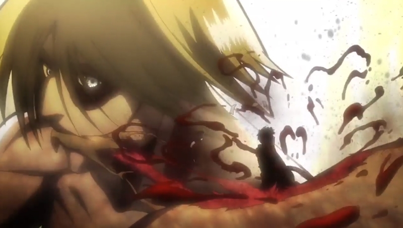 엘렌이 거인화하여 여성형 거인을 무찌르려고 하는데 리바이의 정예반 선배들이 엘렌에게 자신들을 믿어달라며 계속 달려 나가라고 하죠. 엘빈단장이 숨어 있는 곳으로 다다르자 갑자기 포를 쏘아대고 리바이 정예반과 엘렌은 가까스로 여성형 거인에게서 벗어납니다. 엘빈 단장의 작전의 목적을 궁금해하던 사람들은 이제야 알게 됩니다.