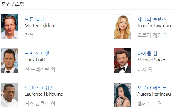 오로라 레인 역의 제니퍼 로렌스는 「헝거게임」, 「엑스맨」 시리즈에 나왔던 배우입니다. 저는 영화 「헝거게임」 시리즈를 보면서 제니퍼 로렌스를 알게 되었지요. 영화 패신저스를 보고 그녀가 이렇게 예뻤나 싶을 정도로 매력적이었습니다. 다음 영화도 제니퍼 로렌스 영화를 볼 것 같습니다.