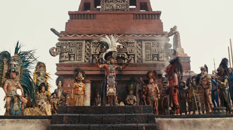 마야제국은 가뭄으로 해충이 늘어나 농작물이 병들고 재앙과도 같은 질병이 계속되자 인신공양을 하는 의식을 치르기 위해 사람들을 잡아온 것입니다. 제물이 도착하자 의식이 시작되고 한명씩 제단에 올려 살아있는 사람의 가슴을 열어 심장을 꺼내 뜨거운 화로에 던져 태웁니다. 그리고 제물의 목을 쳐내고 계단으로 던져버리죠. 밑에 있던 사람들은 환호를 지르며 흐르는 피로 아이들의 이마에 그려 나쁜 기운을 떨쳐냅니다.