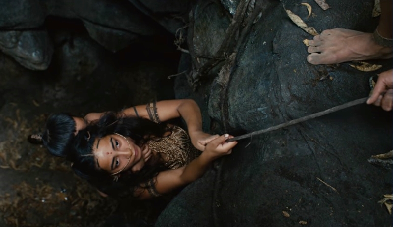 마야제국에 도착한 부족민 중 여자들은 노예로 팔리게 되고 남자들은 몸에 파란 염색을 한 뒤 어딘가로 끌려갑니다. 그들은 무서운 벽화가 그려진 터널을 지나 사람들이 모여있는 곳으로 향하는데 알고보니 그곳은 신전입니다. 인신공양을 하는 마야문명을 알 수 있듯 거대한 신전에는 높은 계단이 있고 그 위에는 마야왕이 있었죠. 그곳으로 끌려올라간 표범발 부족민들.