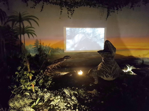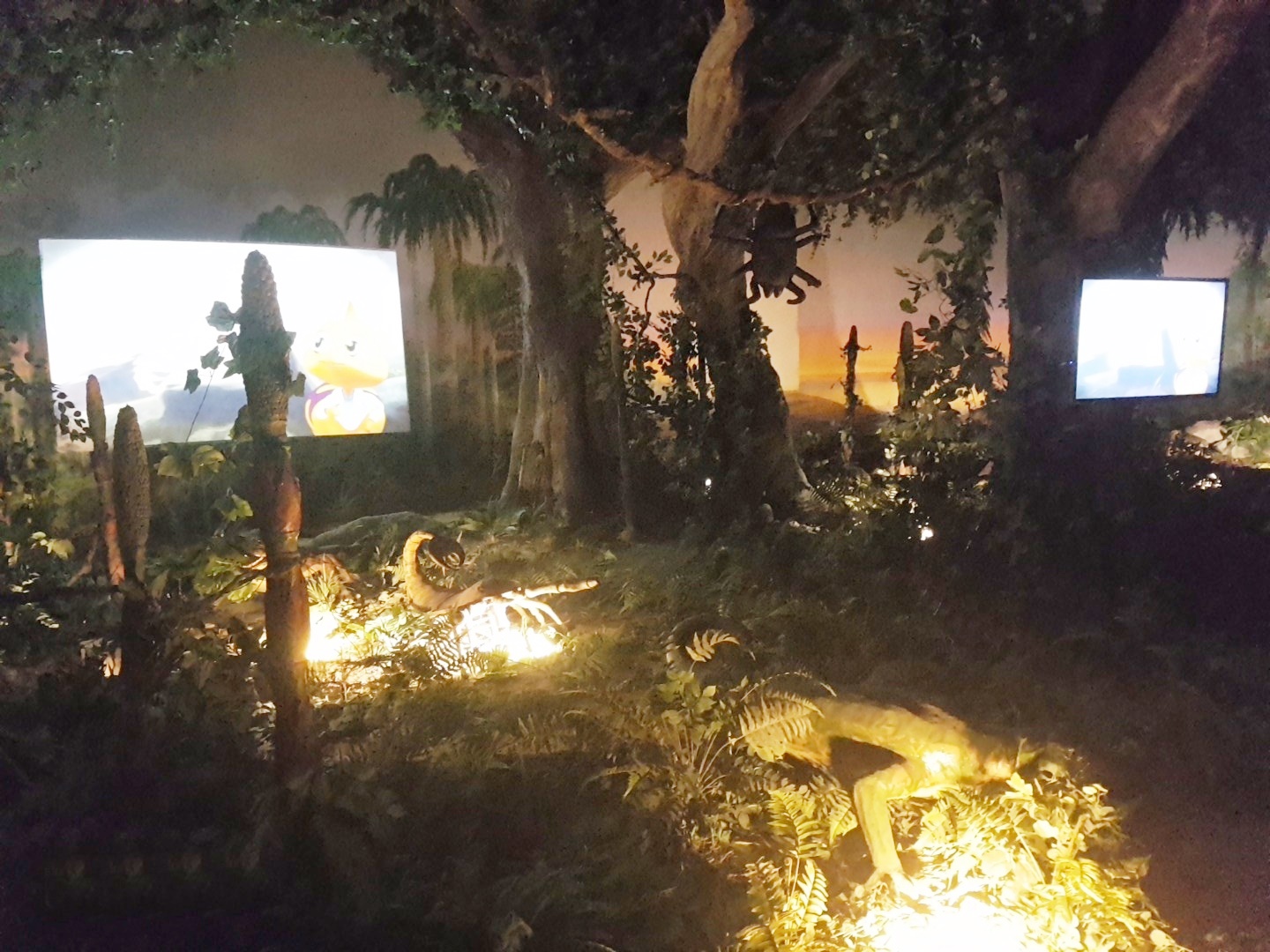 거미열차가 출발하고 입구에 들어가자 네온싸인이 반겨주었습니다. 그리고 나타난 고생대 식물과 거대한 곤충이 있었는데 갑자기 열차가 정지를 했습니다. 그러더니 좌석이 왼쪽으로 90도 돌자 작은 거미캐릭터가 나오네요. 어른과 아이할 것 없이 신기하고 재밌어 했어요. 거미 캐릭터는 고생대 식물이 석탄으로 어떻게 만들어졌는지 설명을 해줬습니다.
