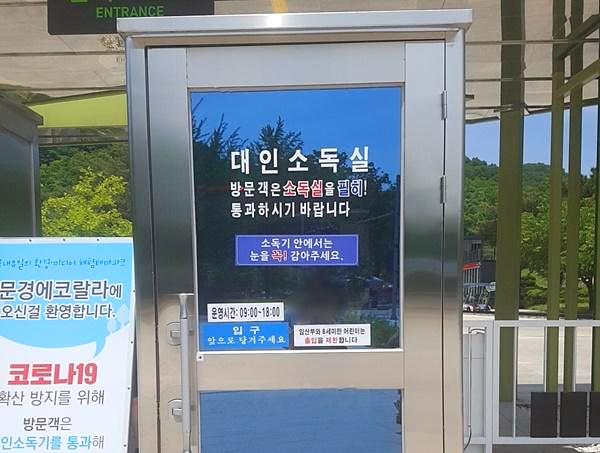 티켓팅을 하고나면 어른들은 살균소독을 해야해서 대인소독실로 들어갔습니다. 그리고 안내판에 적힌대로 15초정도 눈을 감고 소독을 했습니다. 그리고 반대편 문으로 나와 열체크도 했습니다. 입구에서 무조건 마스크를 착용해야 합니다. 너무 더운 날씨라 작은 아들은 부직포 일회용 마스크를 쓰고 갔고 저는 KF94 마스크를 썼는데 좀 힘들었습니다.