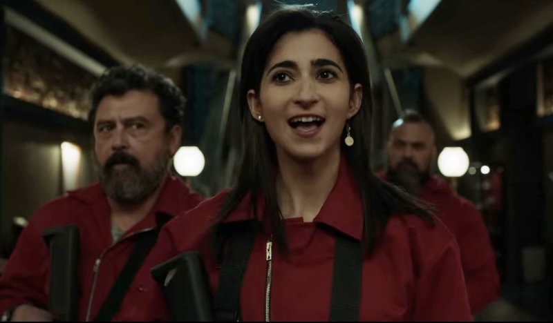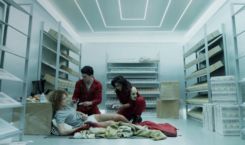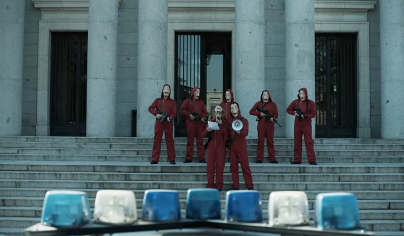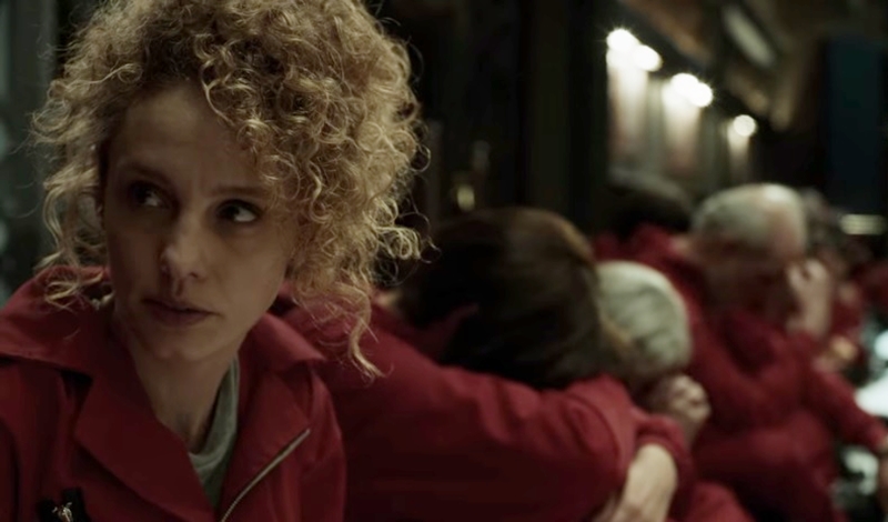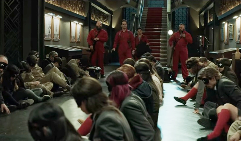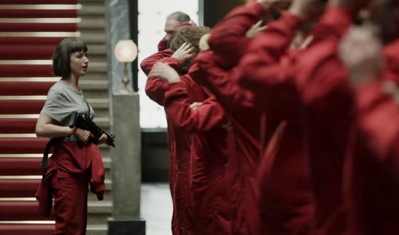 무장강도들은 인질들에게 자신과 똑같은 붉은색 옷을 입히고 가면을 나눠줍니다. 무장한 경찰들에게 자신들을 노출하지 않기 위해서고 혹여 그들에게 총 맞을 일이 생기면 인질들 사이에 숨으면 되니깐요. 강도들은 인질들이 필요한 약품과 요구사항을 들어줍니다. 하지만 조폐국 국장은 불안한 나머지 자신들을 죽일 거라 생각하여 애인인 모니카를 시켜 사무실에 있는 휴대폰을 가져오라고 합니다.