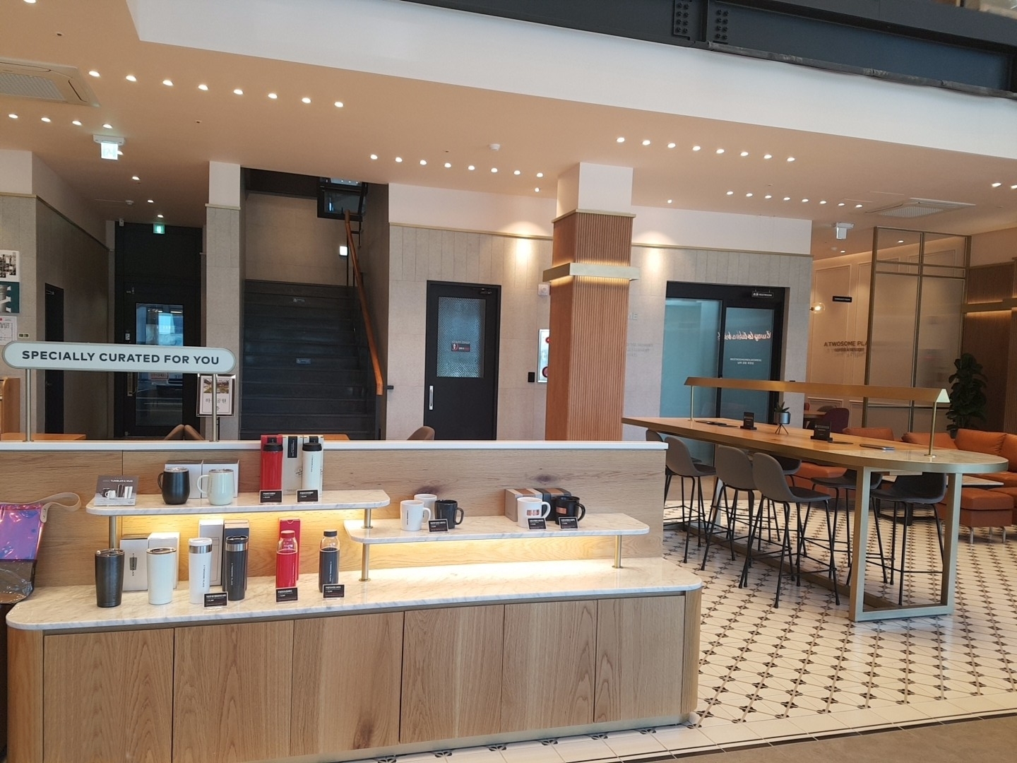 입구에 들어서면 바로 Specially Curated 가 진열이 되어 있고 왼쪽으로 돌아서면 주문하는 곳이 있습니다. 그리고 오른쪽으로 보면 넓은 홀에 좌석들이 배치되어 있는데 큰 테이블과 개인이 혼자서 카공하기 좋은 좌석으로 배치되어 있습니다.