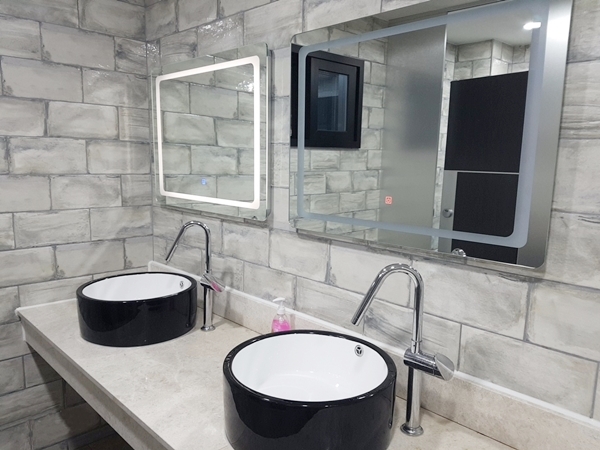 화장실도 깔끔하니 좋았습니다. 물론 신축이라 깔끔하겠지만 화장실 인테리어 스타일이 제 취향이네요. 심플하고 깔끔한 모던 스타일이 좋아요. 그리고 거울에 조명이 달려있어 터치하면 바로 조명이 켜져 화장 고치기에도 좋습니다.