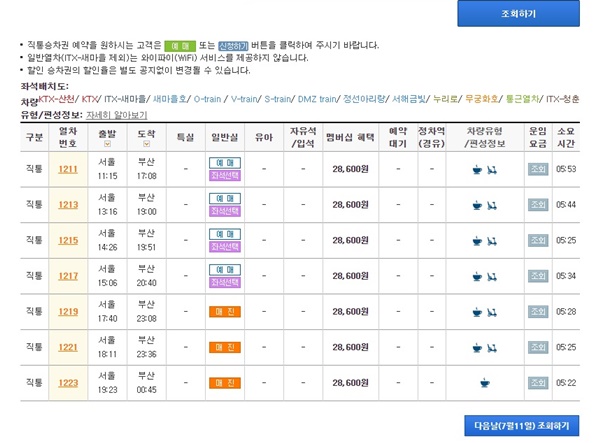그리고 기차종류를 선택하는데 무궁화호를 선택 후 출발역과 도착역을 입력합니다. 특히, 출발일을 꼭 선택하셔야 합니다. 가끔 이 부분을 놓쳐 다시 입력하고 조회해야 하는 번거로움이 생기니깐요. 조회하기 버튼을 클릭하면 원하는 시간의 열차를 선택하시면 됩니다. 먼저 예매하기 버튼과 좌석 선택 버튼이 있는데 좌석 버튼을 클릭해서 원하는 좌석을 먼저 선택하시면 됩니다.
