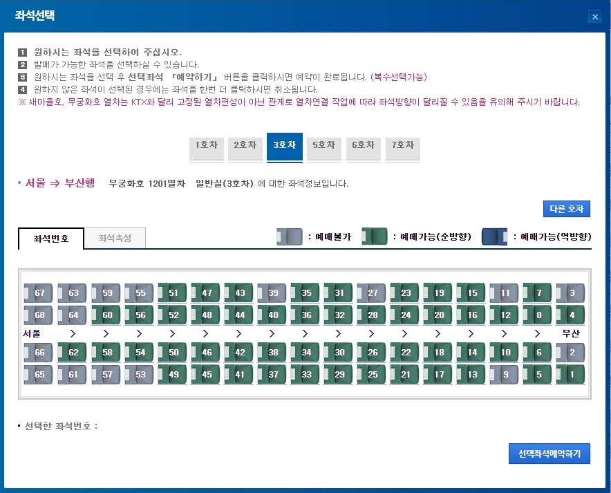 서울에서 부산으로 가는 열차일 경우 승차하는 사람들이 많지만 경북에서 경남으로 가는 열차는 승차하는 사람이 적어 마음이 놓였습니다. 원하는 좌석을 선택하고 아래 '선택좌석예약하기' 버튼을 클릭하시면 결제화면으로 넘어갑니다.