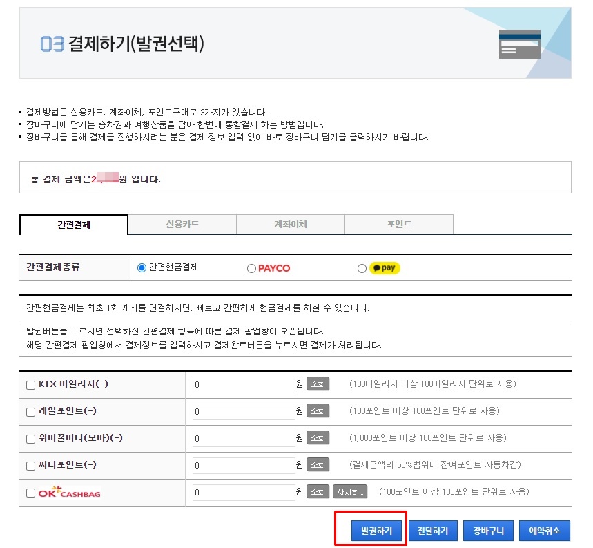 결제는 간편 결제, 신용카드, 계좌이체, 포인트를 이용해서 결제를 하시면 됩니다. 신용카드는 카드정보를 입력해야 하므로 미리 카드를 준비하시면 좋을 것 같습니다. 하지만 요즘 간편 결제로 카카오페이나 PAYCO 로 간단하게 결제를 할 수 있네요. 결제정보를 선택하면 결제하기 또는 발권하기를 선택하셔야 합니다.