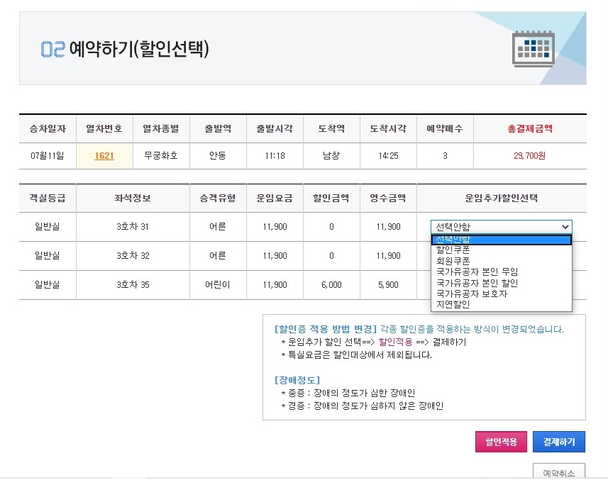 좌석을 예약하고 결제화면으로 넘어오면 '할인 적용'과 '결제하기' 그리고 '예약 취소'를 할 수 있습니다. 승차권을 예약한 후 20분 이내에 결제를 하셔야 승차권을 발권할 수 있습니다. 결제하기 전에 승차권 운임 추가 할인을 받을 수 있으면 해당 승차권을 할인받으시면 됩니다.