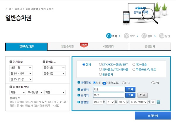 일반승차권 예매할 때 인원정보를 먼저 선택한 후 노선을 입력합니다. 무궁화호일 경우 좌석 방향은 순방향이거나 역방향이 있지만 지금은 코로나로 순방향으로 선택할 수 있고 인원이 홀수인 경우 옆자리는 비워놓고 다음 좌석을 선택할 수 있습니다. 저희는 어른 2명 어린이 1명으로 모두 3명이었지만 불안한 마음에 어린이 1명을 더 추가해서 4자리를 구매해서 타고 갔어요.