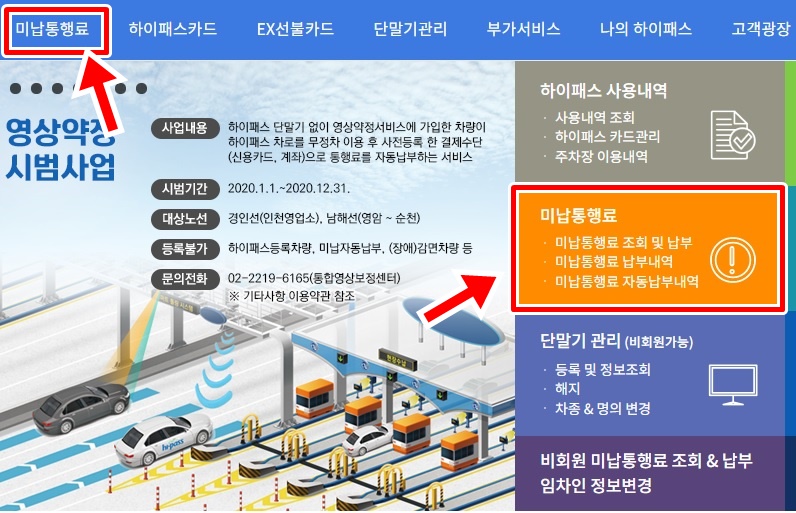 2) 홈페이지 통행료 미납 메뉴에서 확인한다.