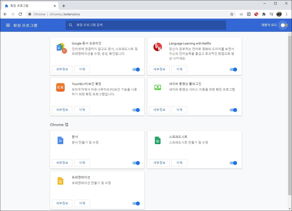 구글 크롬 브라우저에서 다운로드된 확장프로그램을 확인할 수 있고 더 필요한 확장프로그램을 크롬 웹스토어에서 다운로드하여 설치할 수 있습니다. 직접 제가 필요로 하는 확장프로그램을 검색하여 크롬에 설치했습니다.