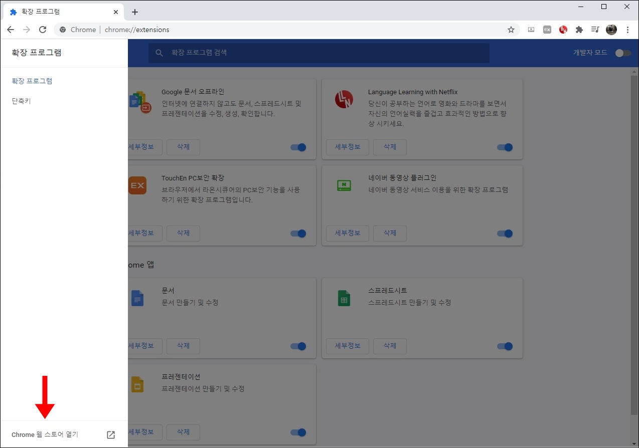 을 선택하면 메뉴 팝업이 나타나고 메뉴 팝업의 하단에 '크롬(Chrome) 웹스토어 열기' 로 가도록 합니다.