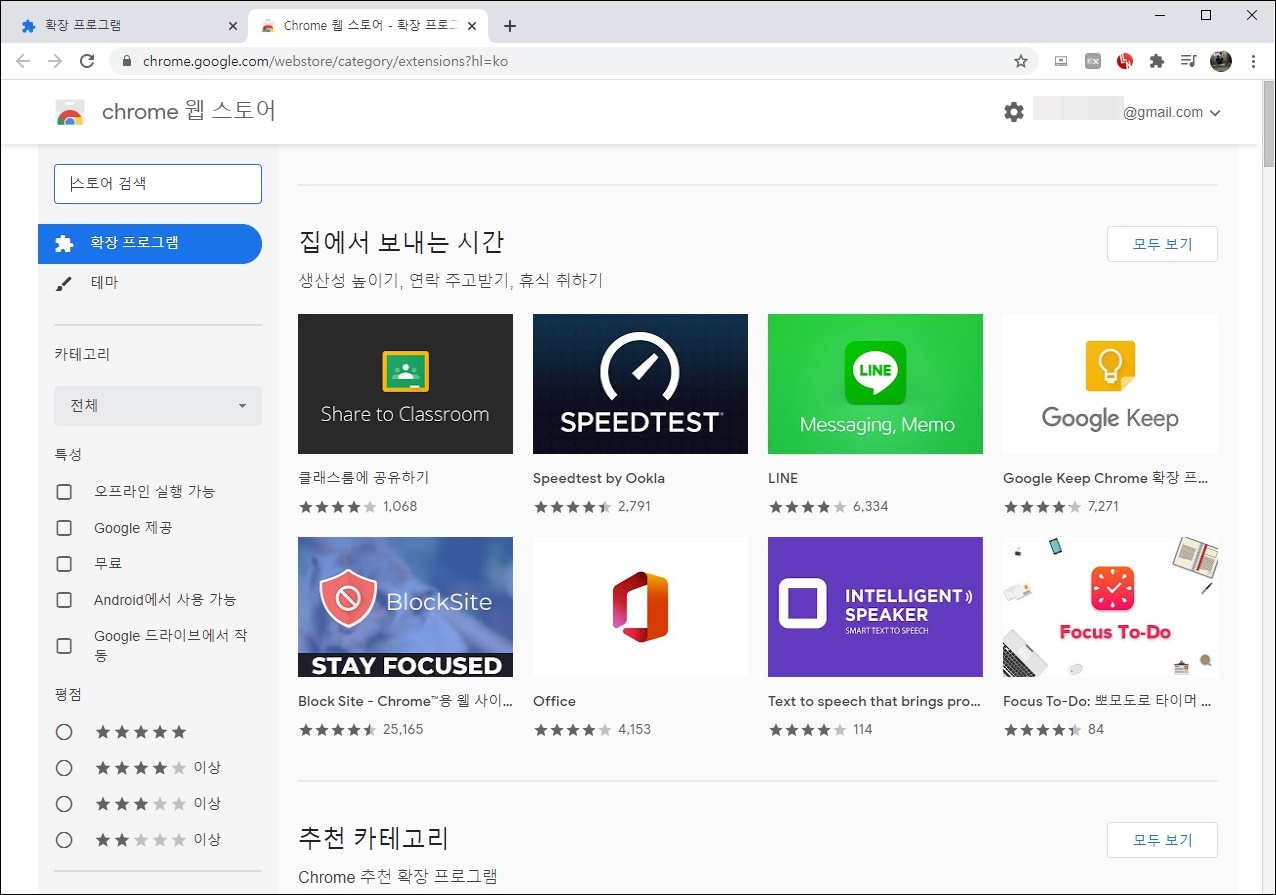 3. Chrome 웹 스토어 열기를 하면 다양한 확장프로그램들을 볼 수 있습니다. 메뉴에는 '확장프로그램' 과 '테마' 두 가지로 나뉘어 있습니다. '확장프로그램' → 카테고리를 선택하여 원하는 확장프로그램을 설치합니다. 또는 '특성' 을 선택하여 검색 범위를 좁히는 것도 좋습니다.