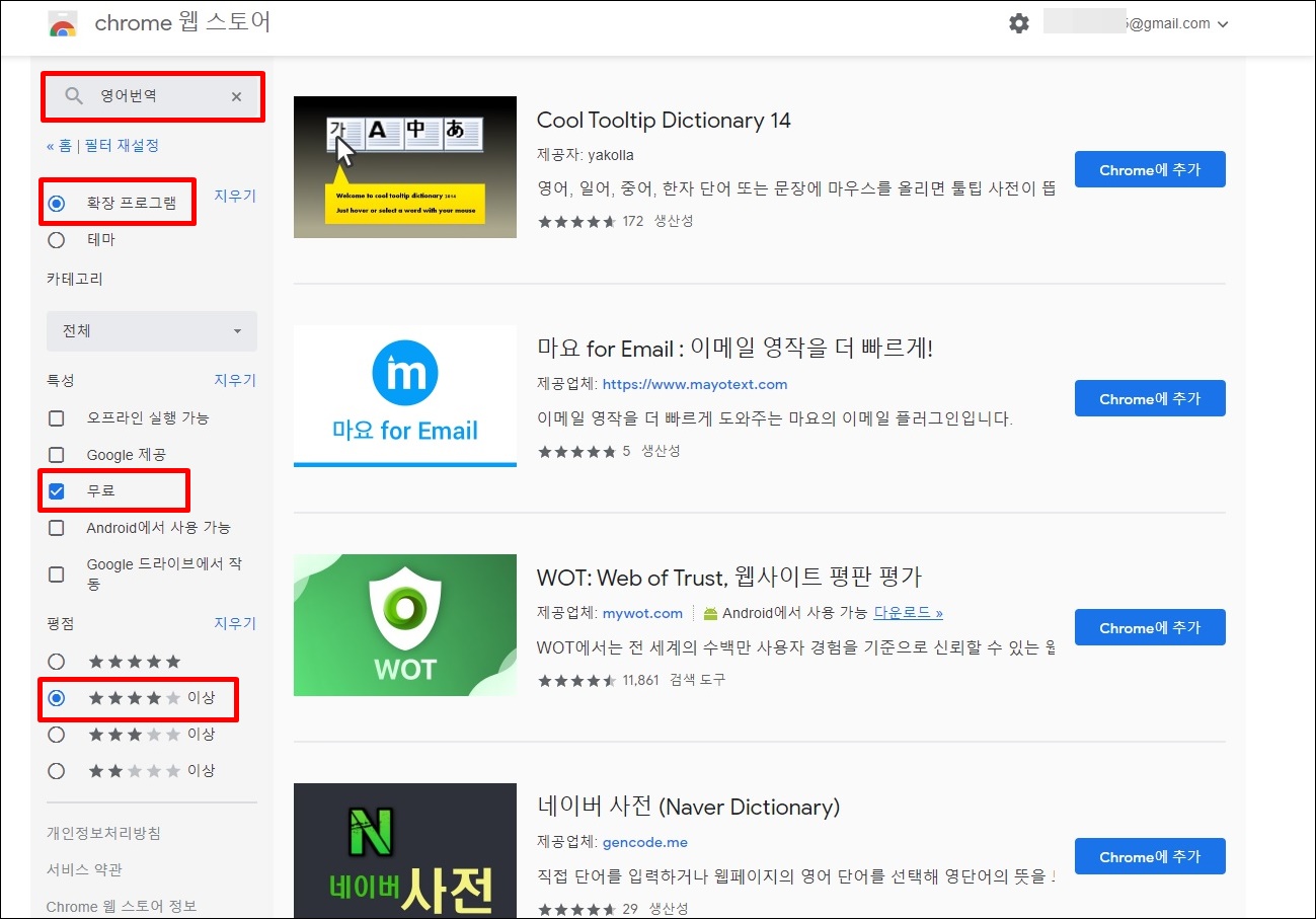 5. '영어번역' 검색어의 검색결과입니다. 추가 검색으로 '확장프로그램' , '무료','별 4개이상' 을 상세 조건으로 검색하였습니다.