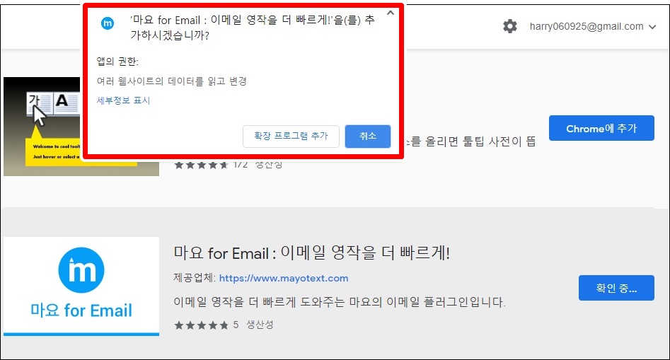 7. '마요 for Email' 을 설치하기로 정하고 '마요 for Email 을 추가하시겠습니까?'→ '확장프로그램 추가' 하였습니다. 아래 그림과 같이 확장프로그램이 설치된 것을 확인할 수 있습니다.