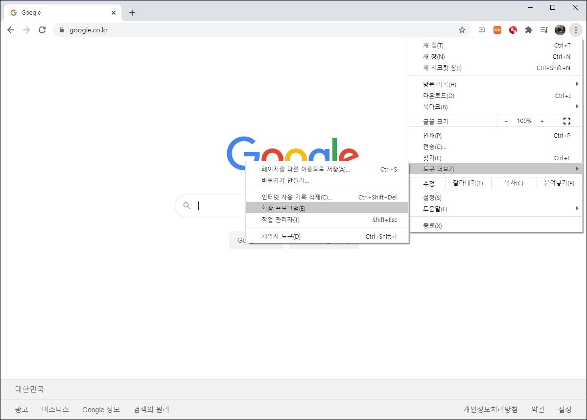 을 선택하고 '도구 더보기' → '확장프로그램' 선택하시면 크롬 브라우저에 설치된 확장 프로그램을 한눈에 확인할 수 있습니다.