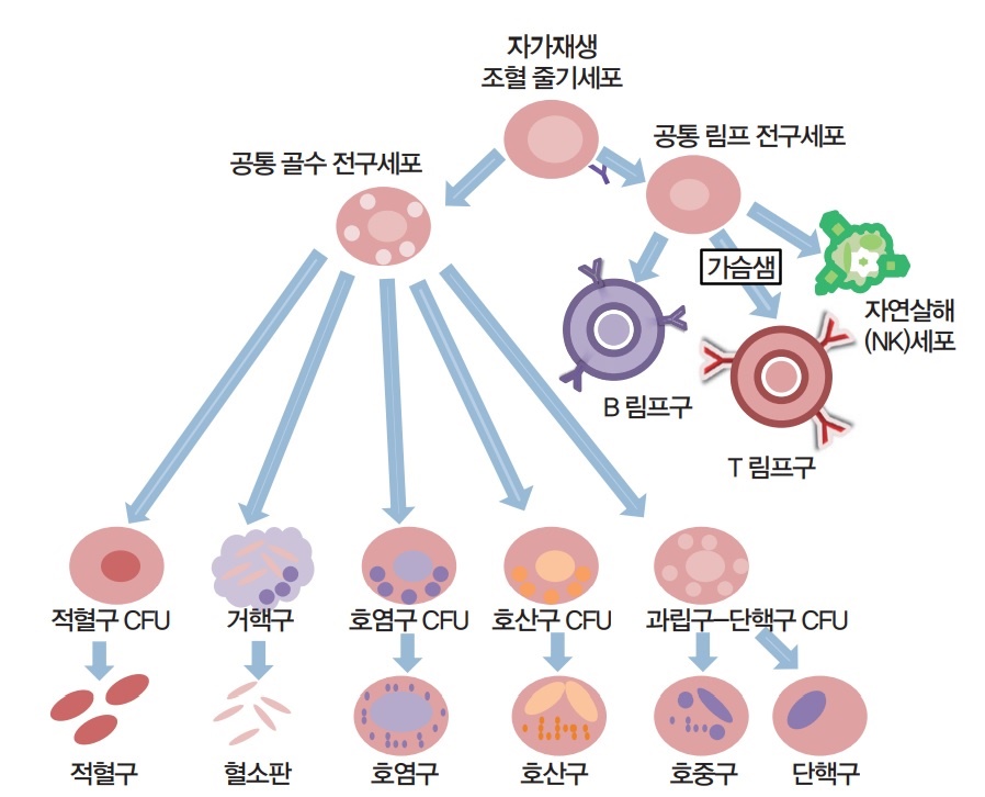 - 골수 : 적혈구, 백혈구, 항체를 만드는 B림프구를 생성