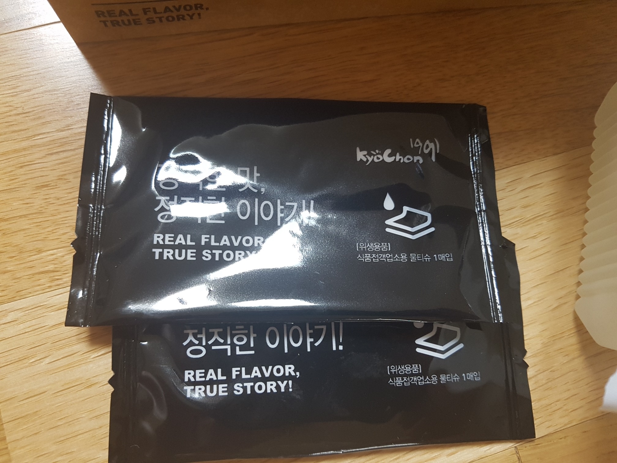 교촌치킨의 치킨무도 각 한 개씩이고 검은 색 포장으로 된 물티슈가 각각 2개씩, 나무젖가락도 각각 2개씩이었습니다. 콜라는 펩시콜라를 주시더라구요. 전 입 안에 톡 쏘는 코카콜라를 더 좋아해서 집에 있는 걸 꺼내 마셨어요.