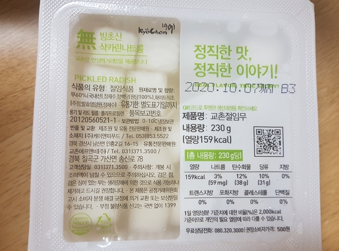 교촌치킨의 닭고기는 믿도 먹어도 될만큼 잡내도 없고 신선했습니다. 닭비린내가 나면 그 자리에서 손을 놓고 입에 대지 않는데 전혀 잡내가 나지 않아서 좋았습니다. 교촌치킨의 치킨무 또한 괜찮다는 생각이 든게 빙초산 대신 화이트 식초를 사용하여 코가 찡할만큼 신맛이 나지 않았습니다. 아이들이 먹어도 안심이 되었어요. 타치킨의 치킨무는 아이들 먹지 못하게 치워버렸거든요.