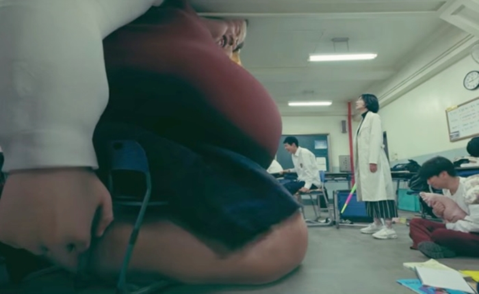 홍인표선생이 압지석을 들어 뒤집자 바로 지진이 난 것처럼 '쿵~' 거리는 소리가 들리고 안은영선생은 실성한 아이들이 옥상으로 올라가는 것을 보고 따라올라갑니다. 그곳에 실성한 아이들이 옥상 펜스에 올라 떨어져 죽으려고 하자 안은영선생은 장난감 칼을 들고 아이들을 구해내지요.