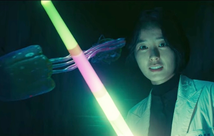안은영선생은 어떤 기운을 느끼고는 지하실에 홍인표선생을 놔두고 황급히 뛰쳐나가 보건실로 가서 자신의 장난감 칼을 보고는 울어버립니다. 다시 젤리를 퇴치해야 하는 운명이 된 것이죠. 잠시나마 평범한 세상을 볼 수 있어서 행복했다는 안은영선생.