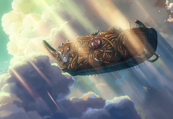 그때 하늘을 나는 배를 보게 되죠. 그 배는 신이 타는 배 '샤쿠나 비마나' 라고 합니다. 샤쿠나 비마나가 지나가자 아스나가 라디오에 사용하던 광석이 빛나고 있습니다. 아스나가 가진 광석 또한 크라비아였어요. 선생님과 아스나는 그 배가 향하는 곳으로 가기로 합니다.