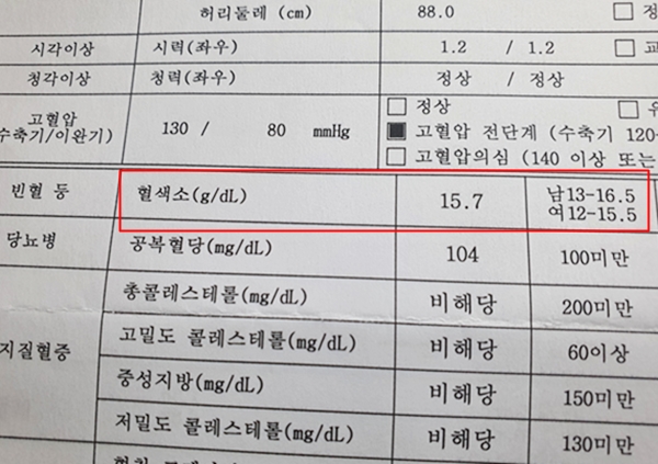 건강검진 결과표에서도 보았듯이 혈색소 수치가 15.7로 나왔는데요. 혈색소 수치가 낮으면 빈혈이 되고 혈색소 수치가 높으면 혈색소과다가 되겠습니다. 혈색소과다일 경우 그 원인을 추적하여 치료해야 할 것입니다.