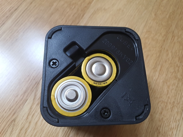 큐브 측면에 전원 버튼이 있어서 사용할 경우 전원을 켜 둡니다. 그리고 큐브의 아래를 보면 건전지가 들어가는 곳이 있는데 건전지는 C Cell의 1.5v 두 개가 들어갑니다.