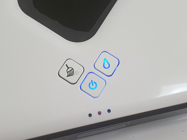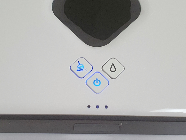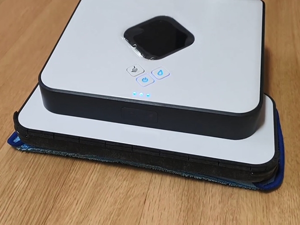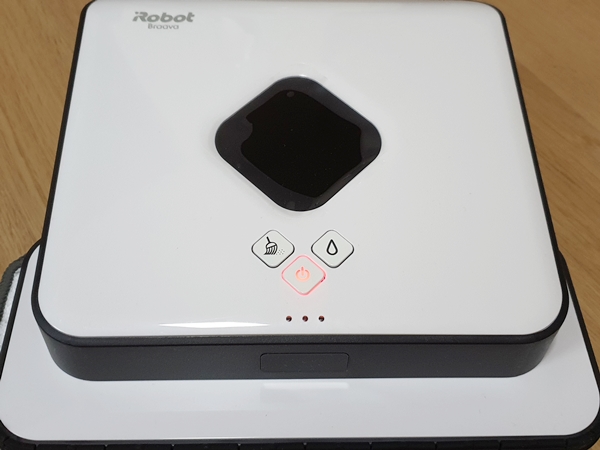아이가 요구르트를 먹다 흘려놓은 몇 방울이 굳어 있었는데 잘 보이지 않아 제가 청소를 못했더라구요. 그래서 아이로봇이 청소해줄 거라 생각했지만 완전히 닦아주지 못해서 제가 물티슈로 박박 문질러서 지웠습니다. 그리고 오른쪽에 물방울 모양의 버튼을 누르면 물걸레가 시작됩니다.
