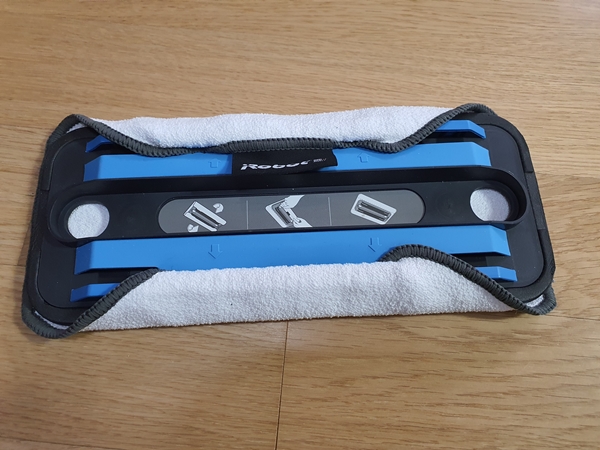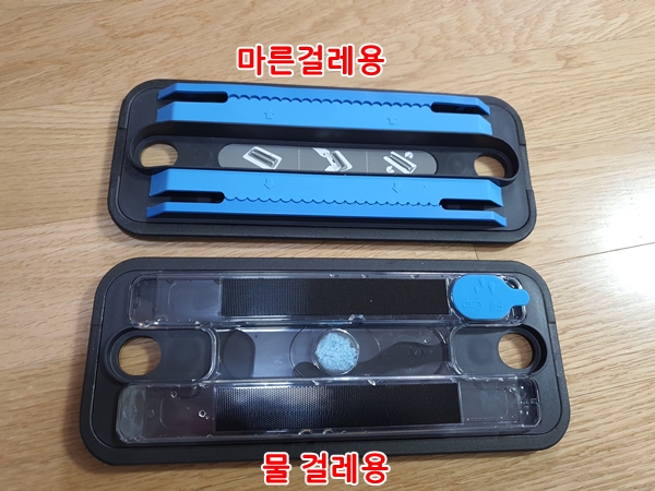 그리고 물을 채운 후 물걸레용 파란 걸레를 벨크로에 붙여줍니다. 물걸레질을 할 때 마른걸레를 사용하지 않도록 합니다. 파란 걸레의 극세사가 물청소를 할 때 바닥을 깨끗이 닦아주지만 오래된 흔적의 때는 바로 제거되지 않았습니다.