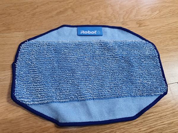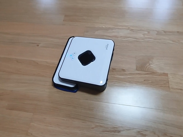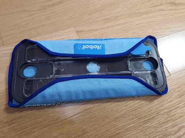 아이로봇으로 바닥의 미세먼지를 제거하려면 마른걸레를 청소 패드 거치대에 끼웁니다. 보통 밀대에 부직포를 끼우듯이 홈에 맞춰 끼워주시면 됩니다. 그런 후 본체의 범퍼에 끼운 후 전원을 켜서 빗자루 모양의 버튼을 눌러주면 파란색 빛으로 바뀌면서 로봇이 작동이 됩니다.