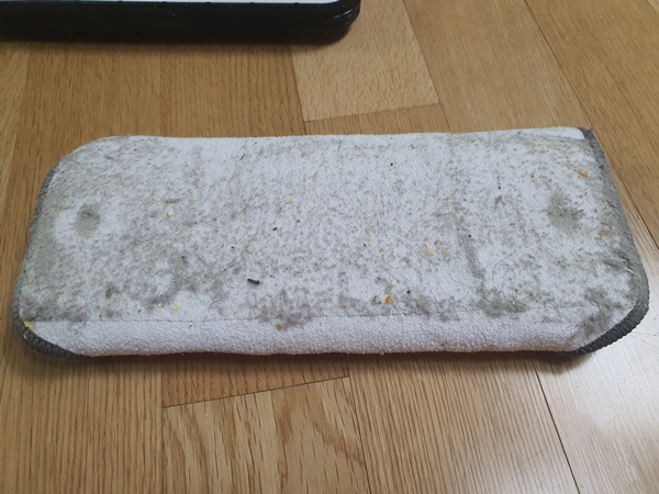 아이로봇의 물걸레질도 바닥이 반들반들하니 청소를 잘 해내지요. 하지만 위에서도 언급했듯이 며칠 마른 자국은 걸레의 물기가 적어서인지 잘 닦이지 않아 물티슈로 문질러서 지웠습니다. 이렇게 청소를 잘하고 난 뒤 가장 중요한 것은 더러워진 걸레를 깨끗이 빨아야 되는 문제가 생깁니다.