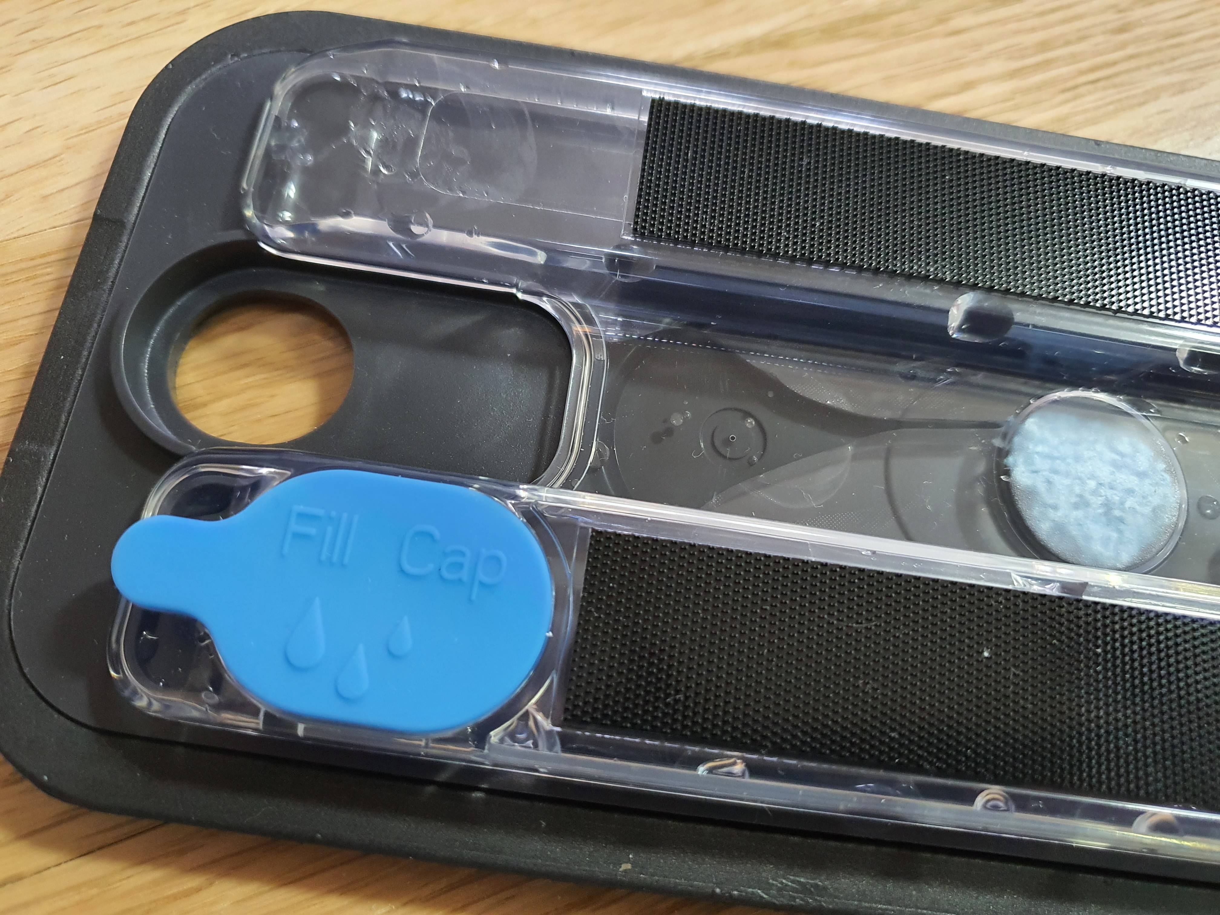 아이로봇으로 바닥을 물걸레로 닦고 싶을 때는 물걸레용 청소패드 거치대를 사용합니다. 거치대에 파란 마개가 있는데요. 'Fill Cap'이라는 파란 마개를 열어 물을 채워줍니다. 여기서 수돗물을 세게 틀어서 받는다면 물난리가 날 테니 수돗물을 조금 틀어서 천천히 채워주세요.