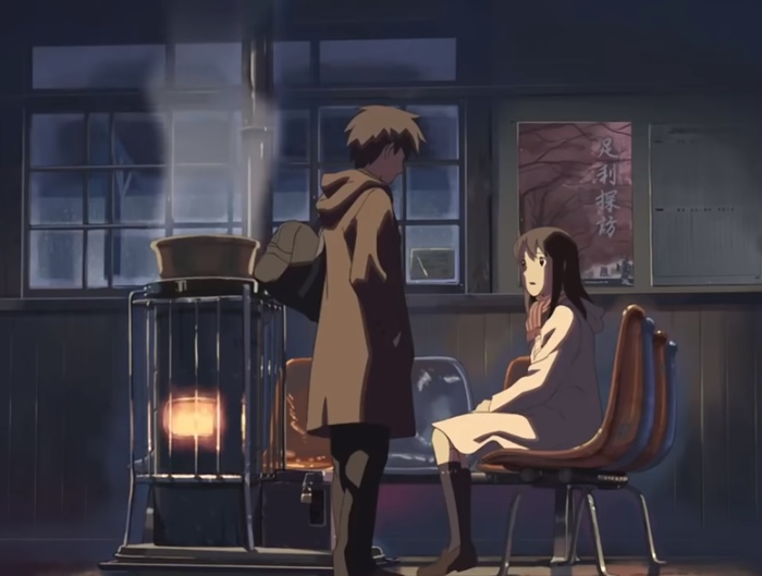 도착한 역 대합실에는 난로 앞에 앉아 있는 아카리를 보고 반가워하고 아카리가 싸온 도시락을 먹으며 허기를 달래는데 곧 역은 문을 닫을 시간이 됩니다. 두 사람은 아카리가 편지에 적은 큰 벚꽃나무 아래에서 두 사람은 첫 키스를 하죠. 그리고 오두막에서 함께 얘기를 나누며 보냅니다.